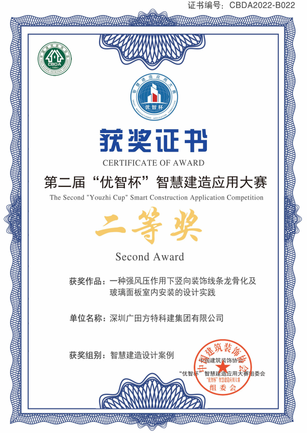 2022年12月16日,第二届“优智杯”智慧建造应用大赛获奖名单对外发布,由广田飞速极官方网站参赛作品——“一种强风压作用下竖向装饰线条龙骨化及玻璃面板室内安装的设计实践”荣获智慧建造设计案例类别“二等奖”。