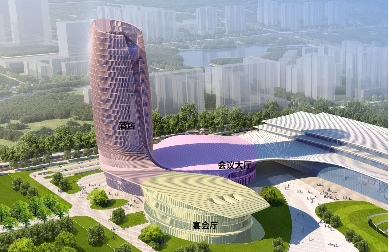项目基地位于平潭高铁中心站片区,总建筑面积14.6万平方米。项目主体分为三个部分,其中南面为展览展示中心,东北面为酒店和宴会厅,中部为会议中心。